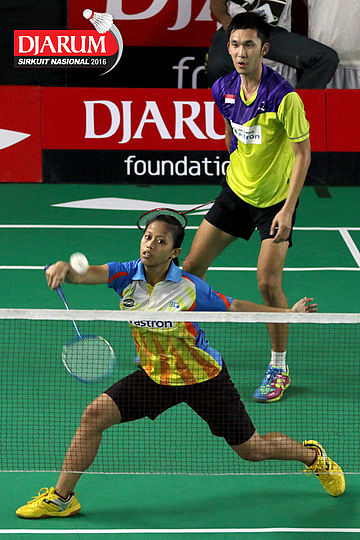 Yohanes Rendy/Dian Fitriani (Pertamina Fastron) mengembalikan shuttlecock.