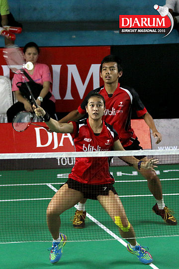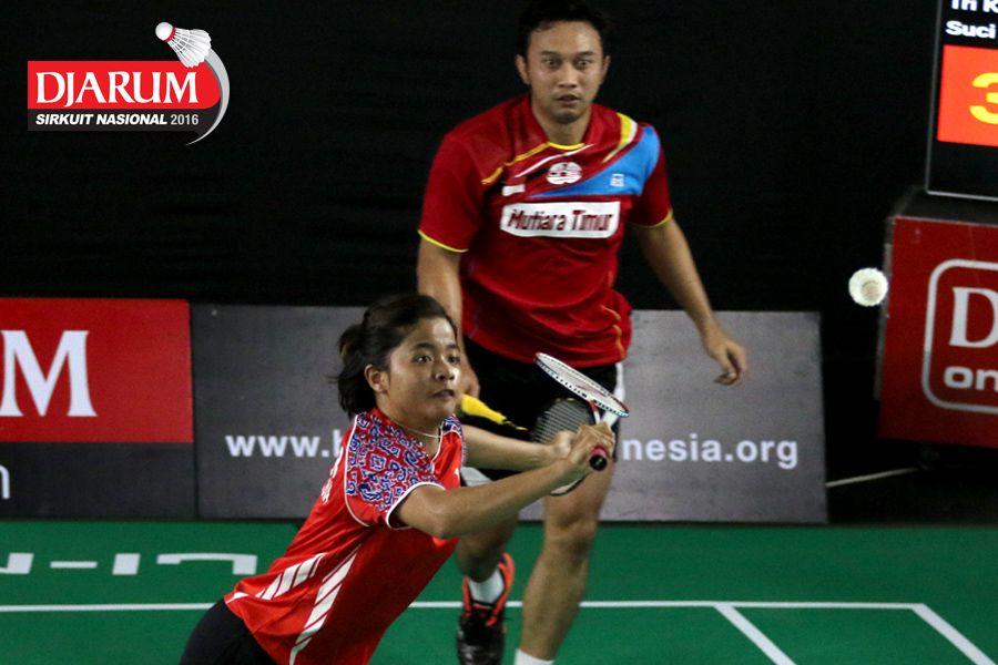 Trikusuma Wardhana/Suci Rizki (Exist/Mutiara Cardinal) mengembalikan shuttlecock.