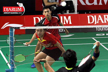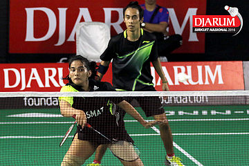 Tedi Supriadi/Keshya Nurvita (Djarum Kudus/Berkat Abadi) menghadang serangan.