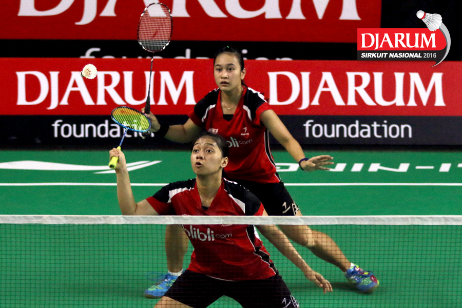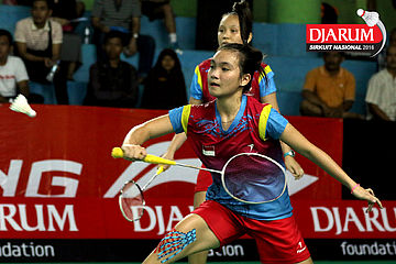 Indah Cahya/Lisa Ayu (Djarum Kudus) bersiap menyambar pengembalian.
