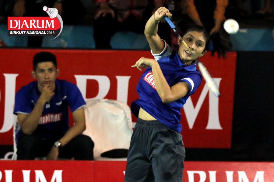 Putri Andini/Rayhan Vania (Mutiara Cardinal) bersiap menyambar pengembalian.