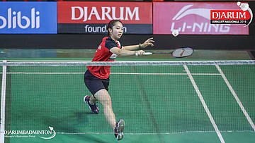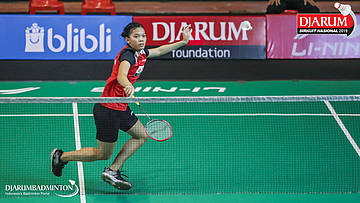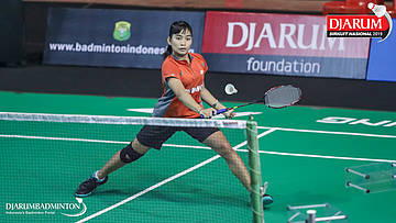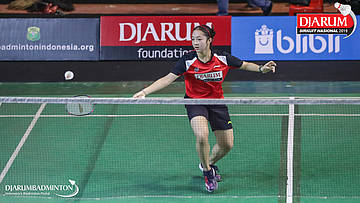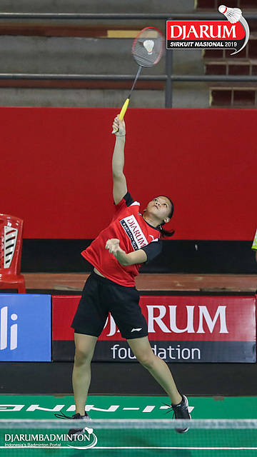 Made Dinda Windiasari (PB Djarum, Kudus) bersiap menyambut shuttlecock