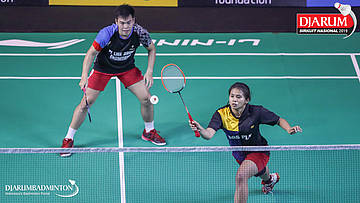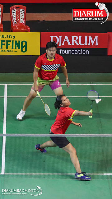 Bryan Sydney Elohim+Pramacella Carenina Intan Sigarlaki (Tangkas , Jaksel+Sangkuriang Graha Sarana PLN Bandung) menyambut shuttlecock