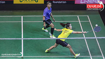 Swiking Imanuel Wuisan+Nathalie Ivyana (Daihatsu Candra Wijaya) menyambar shuttlecock