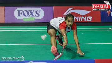 Desima Aqmar Syarafina (PB Djarum, Kudus) berusaha mengembalika serangan