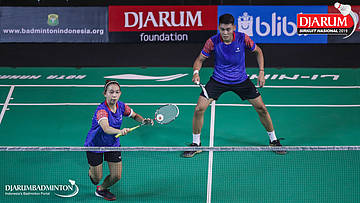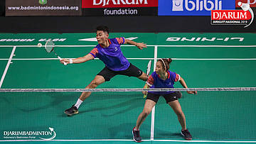 Ardiansyah Putra+Nadiya Melati (PB AIC Badminton Academy+Pertamina Fastron, Jakut) menggapai shuttlecock