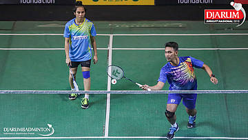 Ardiansyah Putra+Nadiya Melati (PB AIC Badminton Academy+Pertamina Fastron, Jakut) bersiap menyambut pengembalian