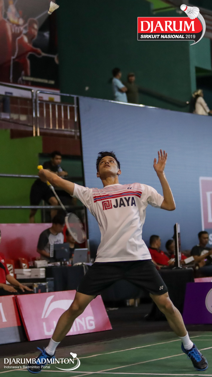Athadhia Ramadhan Rizal (Jaya Raya Jakarta) bersiap mengembalikan shuttlecock
