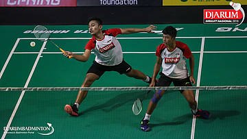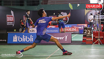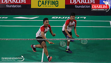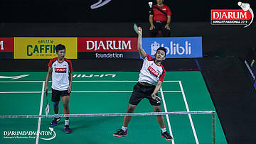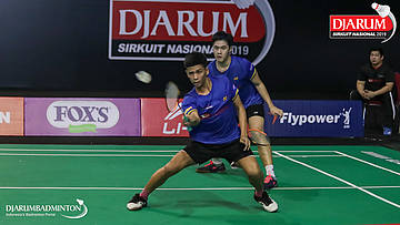 Ghana Muhammad Al Ilham+Mochamad Rafi Rizqi Kurniawan (PB Djarum, Kudus) berusaha menggapi pengembalian
