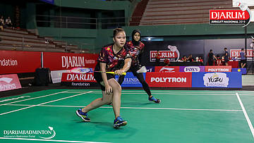 Dea Putri Wales+Dinar Dyah AYUSTINE (PB AIC Badminton Academy+Pertamina Fastron, Jakut) bersiap menyambut shuttlecock