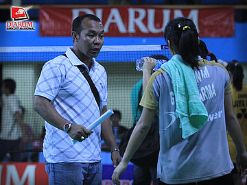 Tri Kusharjanto pelatih Gunadarma memberikan pengarahan