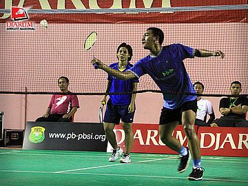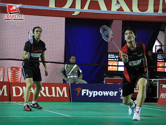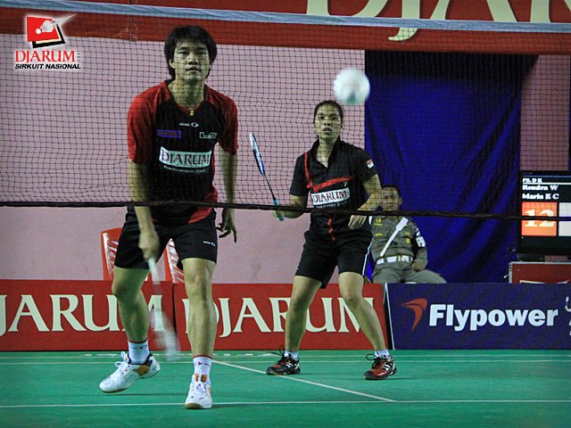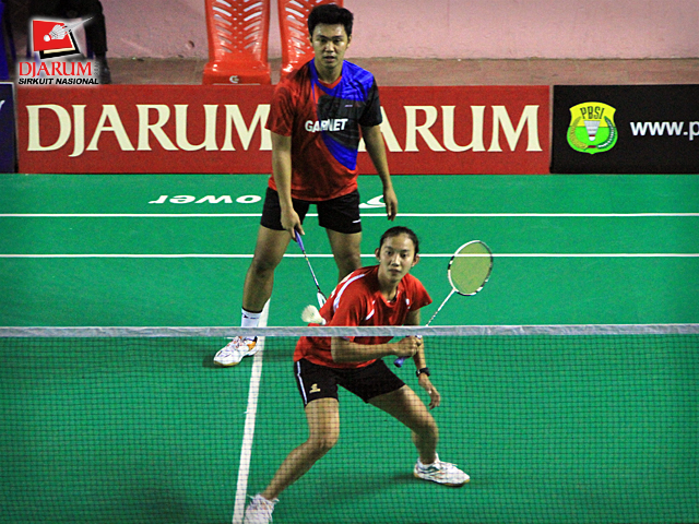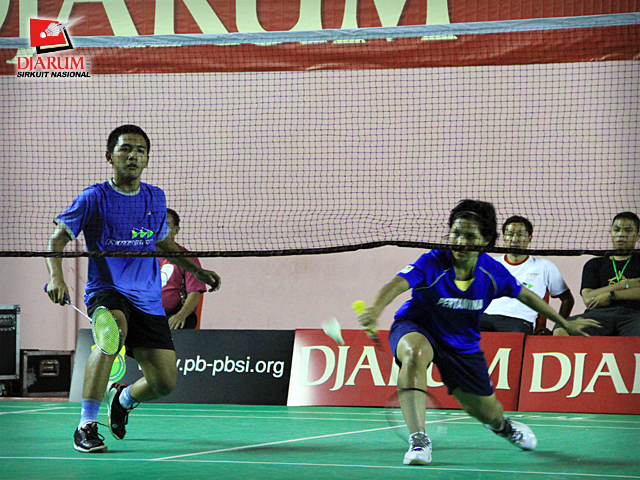 Pemain PB Pertamina Indonesia, Iksawan Indrawan/Novita Gusti mengembalikan kok ke arah pemain PB Ganesha Islamic Village/SGS Elektrik PLN, Ardiansyah/Devi Tika P. dalam babak penyisihan ganda dewasa campuran Djarum Sirkuit Nasional Makassar
