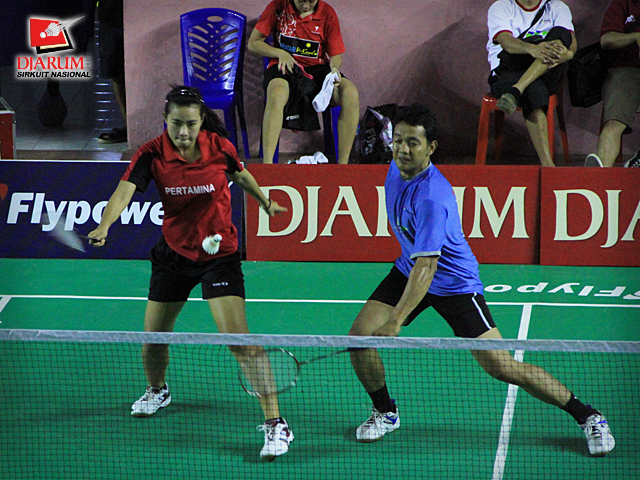 Pemain PB Ganesha Islamic Village/SGS Elektrik PLN, Ardiansyah/Devi Tika P. mengembalikan kok ke arah pemain PB Pertamina Indonesia, Iksawan In./Novita G. dalam babak penyisihan ganda dewasa campuran Djarum Sirkuit Nasional Makassar di GOR Sungguminasa