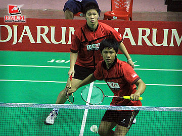 Pemain PB Djarum, Hantoro/Yantoni Edy S berusaha mengembalikan kok ke arah pemain PB Bayu Kencana Pasuruan, Dicky Eko B/M.Taqhjul Arifin B. dalam babak penyisihan ganda remaja putra Djarum Sirkuit Nasional Makassar di GOR Sungguminasa, Gowa, Rabu (19/1