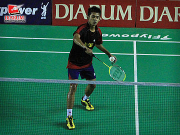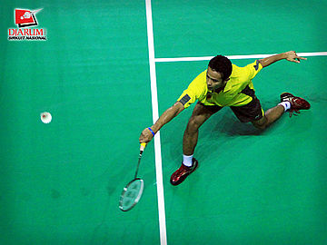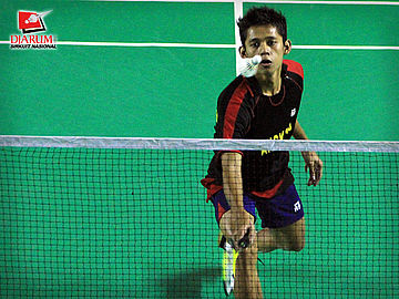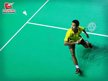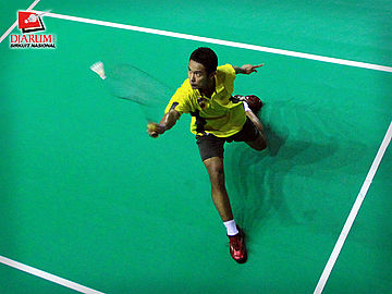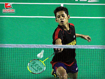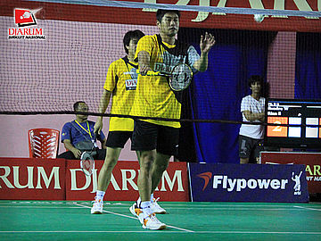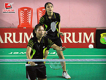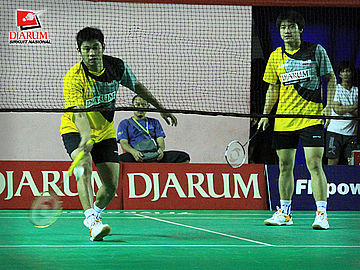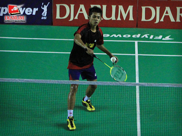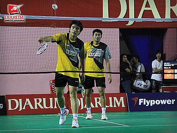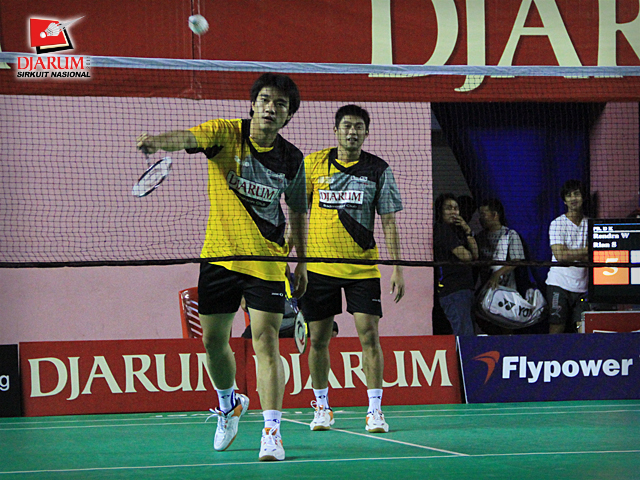 Pemain PB Djarum, Hantoro/Yantoni Edy S berusaha mengembalikan kok ke arah pemain PB Bayu Kencana Pasuruan, Dicky Eko B/M.Taqhjul Arifin B. dalam babak penyisihan ganda remaja putra Djarum Sirkuit Nasional Makassar di GOR Sungguminasa, Gowa, Rabu (19/1