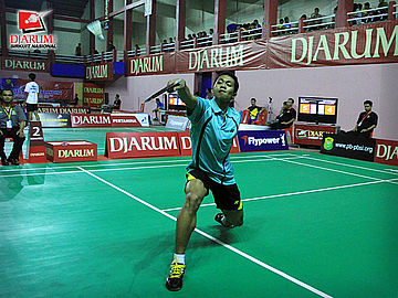Pemain PB. Jaya Raya Suryanaga, Dian Hadi S berusaha mengembalikan kok ke arah Platprov PBSI DKI Jakarta, Muhammad Nizar dalam babak penyisihan tunggal remaja putra Djarum Sirkuit Nasional Makassar di GOR Sungguminasa, Gowa, Senin (17/10).