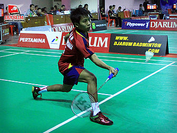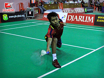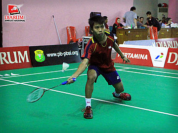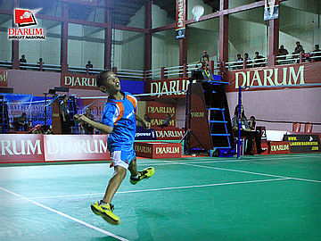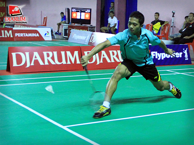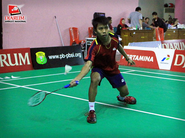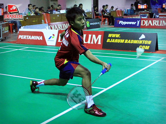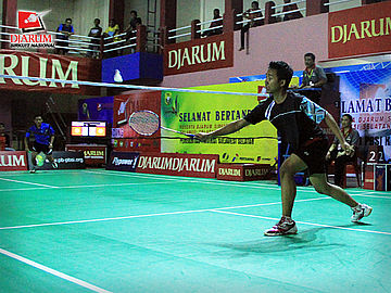 Pemain PB. Fila Watch Makassar, Chairil Anwar berusaha mengembalikan kok ke arah pemain Pusdiklat Jaya Raya, Imam Adi Kusuma dalam babak penyisihan tunggal remaja putra Djarum Sirkuit Nasional Makassar di GOR Sungguminasa , Gowa, Senin (17/10).