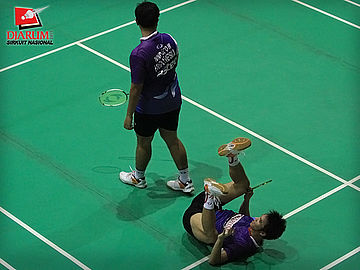 Pemain PB Djarum, Wifqi Windarto terjatuh ketika tengah berlaga kontra rekan setimnya di PB Djarum, Albert Saputra/Rizki Yanu Kresnayandi di babak semifinal Sirkuit Nasional Pangkalpinang di GOR Kacang Pedang, Pangkalpinang, Jumat (23/9).
