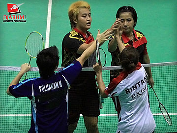 Pasangan ganda putri Natalia Poluakan/Rintan Apriliana (bawah) bersalaman usai berlaga kontra Lita Nurlita/Veriella Aprilsasi di babak semifinal Sirkuit Nasional Pangkalpinang di GOR Kacang Pedang, Pangkalpinang, Jumat (23/9).