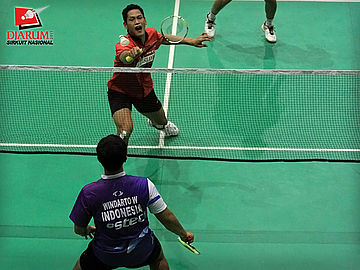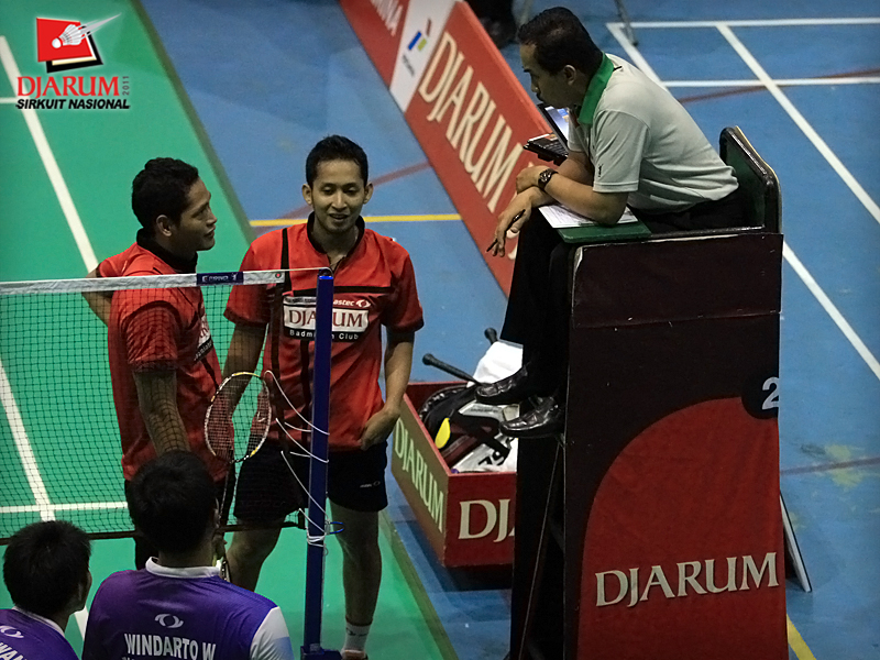 Pasangan ganda putra asal PB Djarum, Albert Saputra/Rizki Yanu Kresnayandi mendapat peringatan dari wasit ketika menghadapi rekan setimnya di PB Djarum, Fernando Kurniawan/Wifqi Windarto di babak semifinal Sirkuit Nasional Pangkalpinang, Jumat (23/09)