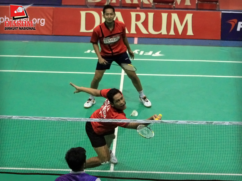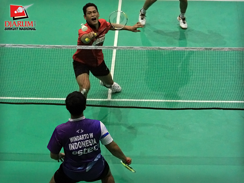 Pasangan ganda putra asal PB Djarum, Rendra Wijaya/Rian Sukmawan berusaha mengembalikan kok ke arah pasangan Andhika Anhar/Hendra Setyo Nugroho di babak semifinal Sirkuit Nasional Pangkalpinang di GOR Kacang Pedang, Pangkalpinang, Jumat (23/9).