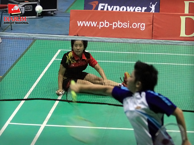 Lita Nurlita (atas) terjatuh ketika berusaha mengembalikan kok ke arah pasangan Natalia Poluakan/Rintan Apriliana di babak semifinal Sirkuit Nasional Pangkalpinang di GOR Kacang Pedang, Pangkalpinang, Jumat (23/9).
