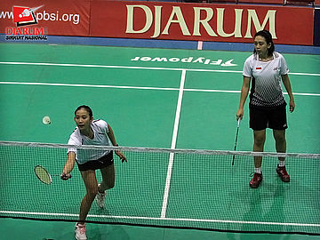 Pasangan ganda putri Devi Tika/Keshya Nurvita Hanadia berusaha mengembalikan kok ke arah pasangan Astuti/Yosephin di babak semifinal Sirkuit Nasional Pangkalpinang di GOR Kacang Pedang, Pangkalpinang, Jumat (23/9).