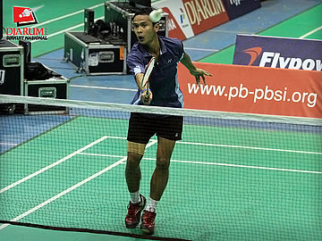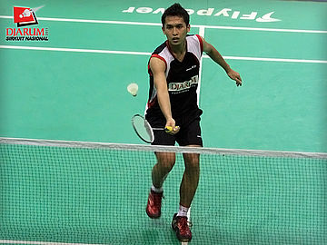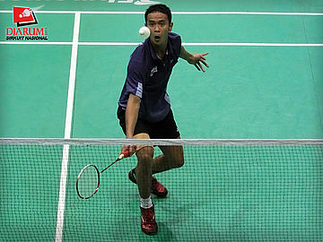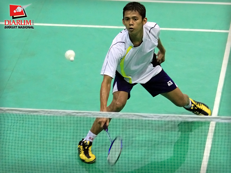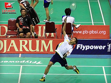 Pemain SGS PLN Bandung, Senatria Agus berusaha mengembalikan kok ke arah pemain PB Djarum, Bandar Sigit di babak semifinal Sirkuit Nasional Pangkalpinang di GOR Kacang Pedang, Pangkalpinang, Jumat (23/9).