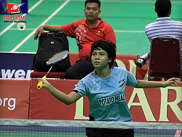 Pemain Pelatprov DKI Jakarta, Ganis Nurrahmadani berusaha mengembalikan kok ke arah pemain PB Djarum, Febby Angguni di babak semifinal Sirkuit Nasional Pangkalpinang di GOR Kacang Pedang, Pangkalpinang, Jumat (23/9).