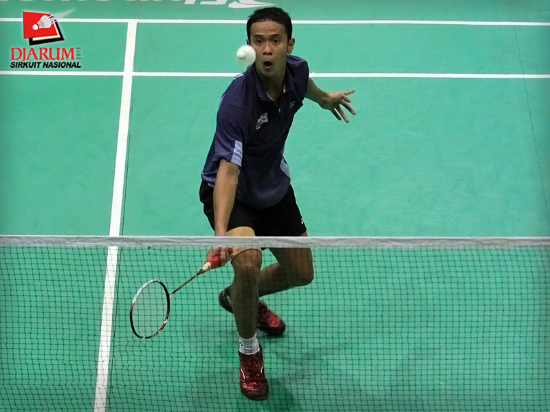 Pemain PB Djarum, Bandar Sigit berusaha mengembalikan kok ke arah pemain SGS PLN Bandung, Senatria Agus di babak semifinal Sirkuit Nasional Pangkalpinang di GOR Kacang Pedang, Pangkalpinang, Jumat (23/9).