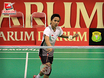 Pemain Pertamina, Alamsyah Yunus berusaha mengembalikan kok ke arah pemain Surya Baja, Hadi Husein dalam babak penyisihan tunggal dewasa putra Djarum Sirkuit