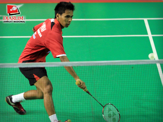 Pemain Pelatnas Panji Akbar Sudrajat mengembalikan kok ke arah pemain MBK, Josua dalam babak penyisihan tunggal dewasa putra Djarum Sirkuit Nasional Surabaya di GOR