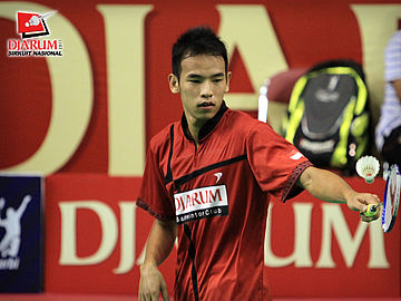 Pemain Bank Sumsel-Babel, Achmad Rivai berusaha mengembalikan kok ke arah pemain PB Djarum, Gary dalam babak penyisihan tunggal dewasa putra Djarum Sirkuit Nasional Surabaya di GOR Sudirman, Surabaya, Selasa (1/11).