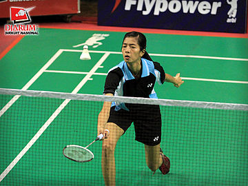 Pemain 21 Jakarta, Melicia Kurniawan berusaha mengembalikan kok ke arah pemain Surya Baja, Silvina Kurniawan dalam babak penyisihan tunggal dewasa putri Djarum Sirkuit Nasional Surabaya di GOR Sudirman, Surabaya, Selasa (1/11).