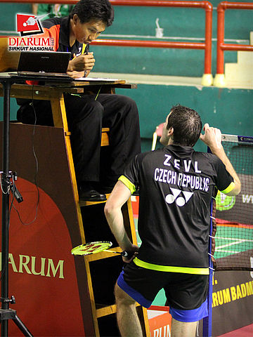 Pemain Czech Republic, Lukas Zevl sedang bertanya kepada wasit dalam babak penyisihan tunggal dewasa putra Djarum Sirkuit Nasional Surabaya di GOR Sudirman, Surabaya, Selasa (1/11).