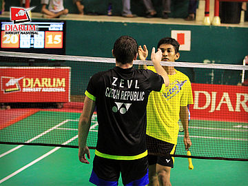 Sportivitas permainan ditunjukkan saat Pemain Angkasa Prestasi Gemilang, Rian Abdul Hamid menang atas lawannya pemain Czech Republic, Lukas Zevl dalam babak penyisihan tunggal dewasa putra Djarum Sirkuit Nasional Surabaya di GOR Sudirman, Surabaya.
