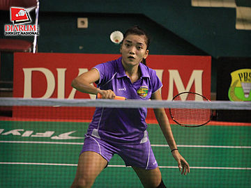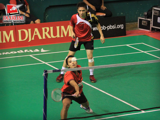 Pemain Phillipina/PB Djarum , Joffre Arollado/Aulia Putri Darajat berusaha mengembalikkan kok kepada pemain Gunadharma/Exist, Trikus Haryanto/Natalia Poluakan dalam babak penyisihan Ganda Dewasa Campuran Djarum Sirkuit Nasional Surabaya di GOR Sudirman.