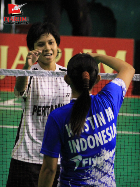 Sportivitas permainan ditunjukkan saat pemain Pertamina, Ganis Nurrahmadani menang atas lawannya pemain PB Djarum Kudus, Maria Kristin dalam babak perdelapan final dewasa putri Djarum Sirkuit Nasional Surabaya di GOR Sudirman, Surabaya, Rabu (2/11).