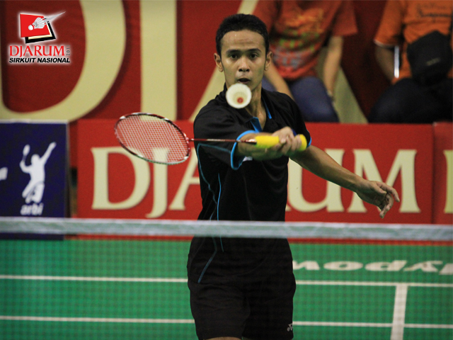 Pemain SGS PLN Bandung, Senatria Agus Setia Putra mengembalikan kok ke arah pemain Jaya Raya Suryanaga, Fauzi Adnan dalam babak Semifinal dewasa putra Djarum Sirkuit Nasional Surabaya di GOR Sudirman, SBY, Jum`at (4/11).