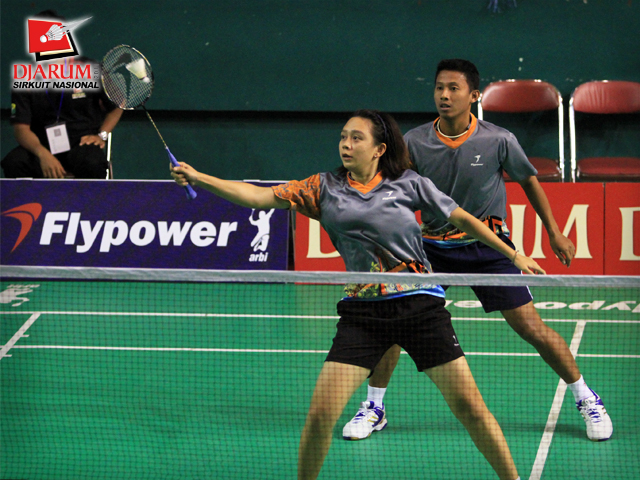 Pemain SGS PLN BDG, Andhika Anhar/Keshya Nurvita Hanadia berusaha mengembalikan kok ke arah pemain Putra Eka/Haris Budiarti dalam babak perempat final Ganda Campuran Dewasa Djarum Sirkuit Nasional Surabaya di GOR Sudirman, Surabaya, Jum`at (4/11).