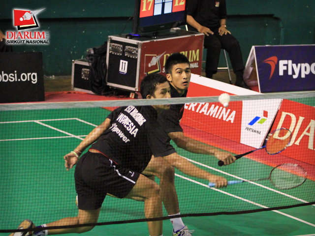 Pemain PB Djarum, Jeka Wiratma/Rafiddias Akhdan N mengembalikan kok ke arah pemain Pusdiklat Jaya Raya, R Eka Fajar Kusuma/Rian Swastedian dalam babak Perempat Taruna Putra Djarum Sirkuit Nasional Surabaya di GOR Sudirman, SBY, Jum`at (4/11).