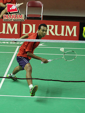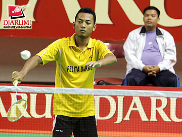 Arif Rahman (PBSI Buleleng) berusah mengembalikan bola ke arah Andreas Adityawarman (PB Djarum Kudus).
