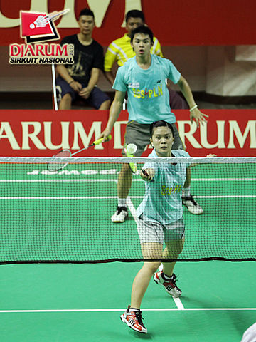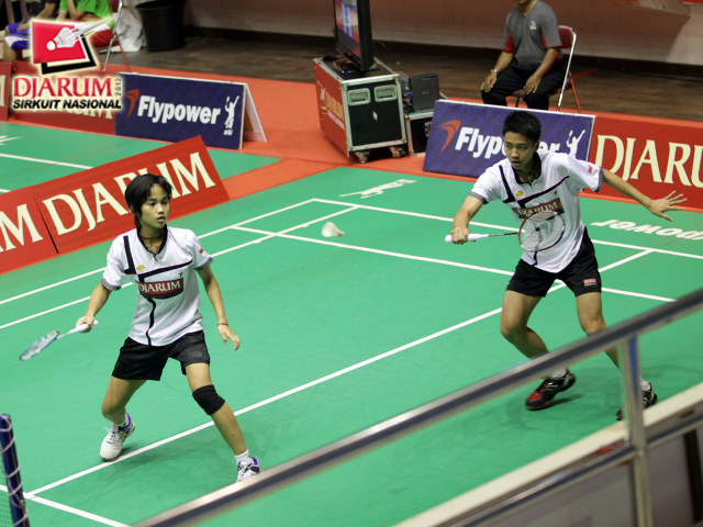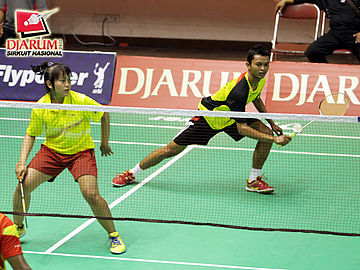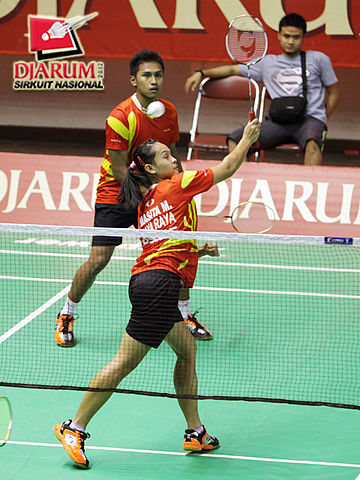 Pasangan ganda campuran taruna SGS PLN, Rendy Istanto/Elizabeth saat menyambut bola yang dilepaskan pasangan Abu Bakar/Della Augustia (PB Djarum Kudus).