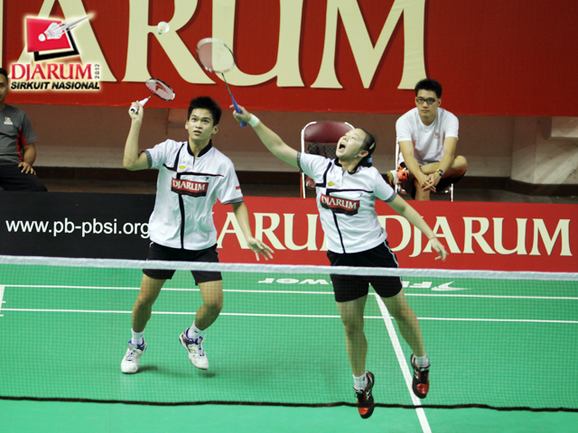 Pasangan ganda campuran taruna PB Djarum Kudus, Ricky Alverino/Fenriani Endar terlihat fokus untuk mengambalikan shuttlecock.