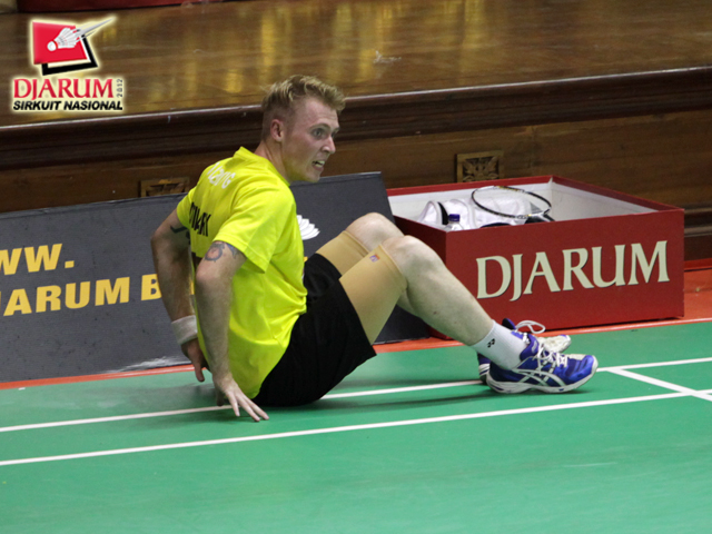 Pebulutangkis asal Denmark, Kevin Colberg sampai jatuh bangun meladeni kekuatan Deni (JR Enkei).