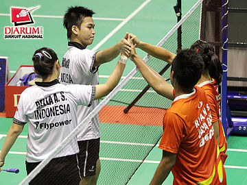 Pasangan ganda campuran taruna PB Djarum Kudus, Abu Bakar/Della Augustia (kiri) bersalaman dengan pasangan Rian Swastedian/Masita Mahmudin (Pusdiklat Jaya Raya) usai pertandingan.