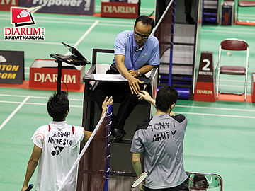 Pebulutangkis Pertamina Indonesia, Alamsyah Yunus (kiri) dan Tan Tony (Jaya Raya Suryanaga) bersalaman dengan wasit usai pertandingan.