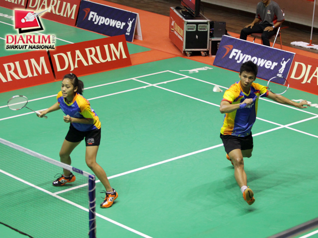 Abu Bakar/Della Augustia (PB Djarum Kudus) berusaha mengembalikan bola ke arah pasangan Rian Swastedian/Masita Mahmudin (Pusdiklat Jaya Raya).