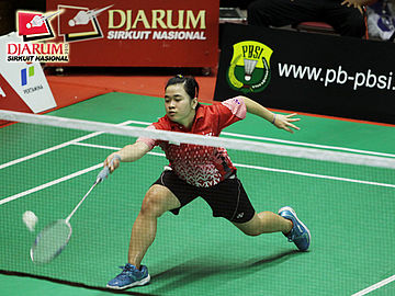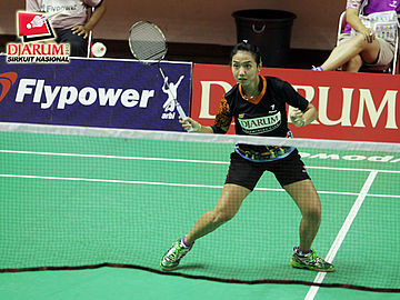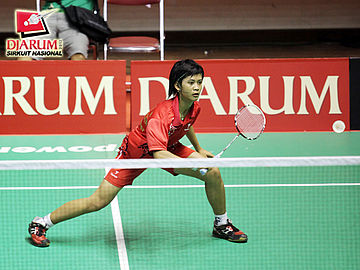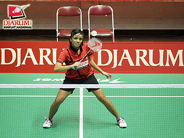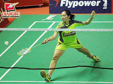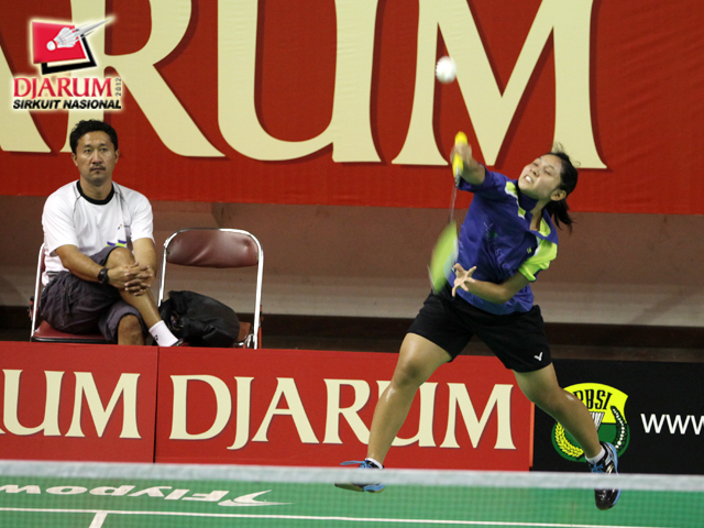 Berliyan Sudrajat (Semen Gersik) berhasil membaca bola drop shoot dari Arinda Sari Sinaga (PB Djarum Kudus).