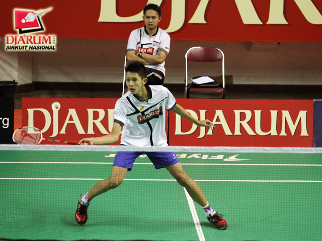 Tunggal taruna putra PB Djarum Kudus, Bayu Pangisthumengembalikan bola ke arah Haris Pratama (Candra Wijaya).